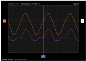 接通-5 V电源。观察示波器通道1上LC谐振电路的输出波形。也可以使用示波器通道2在Q1和Q2的发射极处观察到波形。