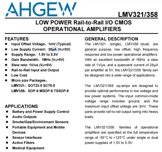 在电池供电控制、传感器接口、便携设备、医疗仪器、有源滤波器等场景中,常面临低功耗、宽电压适配、小封装空间及信号放大稳定性等需求,LMV321/358系列运放可针对性应对。该系列是通用型低功耗CMOS运算放大器,包含单运放LMV321与双运放LMV358,适配1.5~5.5V单电源或±0.75~±2.75V双电源供电,工作温度范围覆盖-55~125℃,能满足高低温工业与便携设备需求。