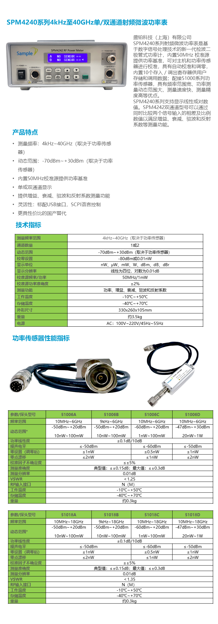 盛铂科技(上海)有限公司SPM4240系列射频微波功率表是基于数字信号处理技术的新一代检波二极管式功率计,内置50MHz 校准源提供功率基准,可对主机和功率传感器进行校准,具有自动校准和调零,内置10个存入/调出寄存器供用户存储和调用数据;配接51000系列功率传感器,具有频率范围宽、功率测量动态范围大、测量速度快、测量精度高等优点。