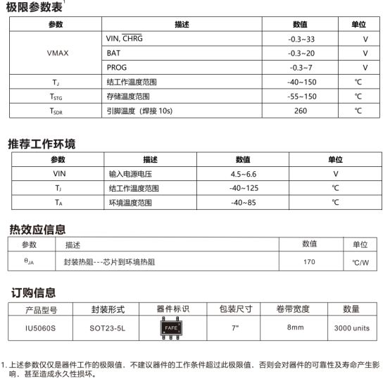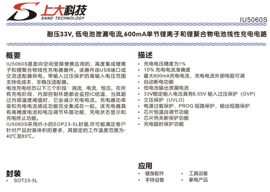 在健身配件、手持设备、工具设备、家电产品等便携场景的供电设计中,常面临小封装空间、低功耗续航、充电安全及宽电压适配等需求,IU5060S可针对性应对这些需求。该器件是一款高度集成的单节锂离子/锂聚合物电池线性充电电路,采用SOT23-5L纤小封装,输入耐压达33V,工作电压范围4.5~6.6V,最大充电电流600mA且可通过外部电阻灵活调节,额定工作温度覆盖-40~85℃,适配各类便携设备的空间与环境需求。