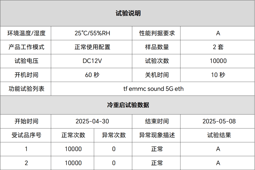 冷重启试验设置了10000次的标准开关机循环测试,热重启试验设置了2083次的标准开关机循环测试,这一严苛的测试标准远超常规工业设备的要求。