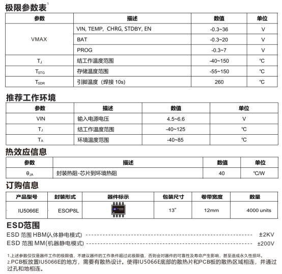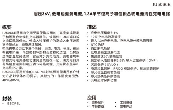 在健身配件、手持设备等便携场景,IU5066E是高度集成的单节锂离子/锂聚合物电池线性充电电路,采用ESOP8L封装,输入耐压36V、工作电压4.5~6.6V,最大充电电流1.3A且可调,工作温度-40~85℃,适配快充与空间需求。