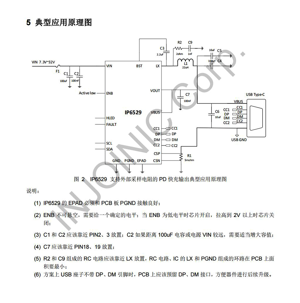 英集芯IP6529采用同步开关降压架构,内置功率MOS管,实现控制器与开关管的单芯片集成。该设计简化了电路结构,减少外围元件数量,结合QFN24(4mm×4mm)紧凑封装,为散热与接口扩展留出空间。芯片支持7.3V-32V宽输入电压,适应汽车电瓶及DC-DC模块等复杂电源,输出电压3V-21V,可满足手机、平板、笔记本等多种设备充电需求。