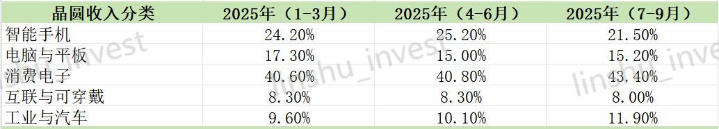 第三季度,智能手机的占比降低了约3.5%,分摊到消费电子领域(2%+)和工业与汽车领域(1%+)。从制程技术上来说,从先进制程向成熟制程转移。