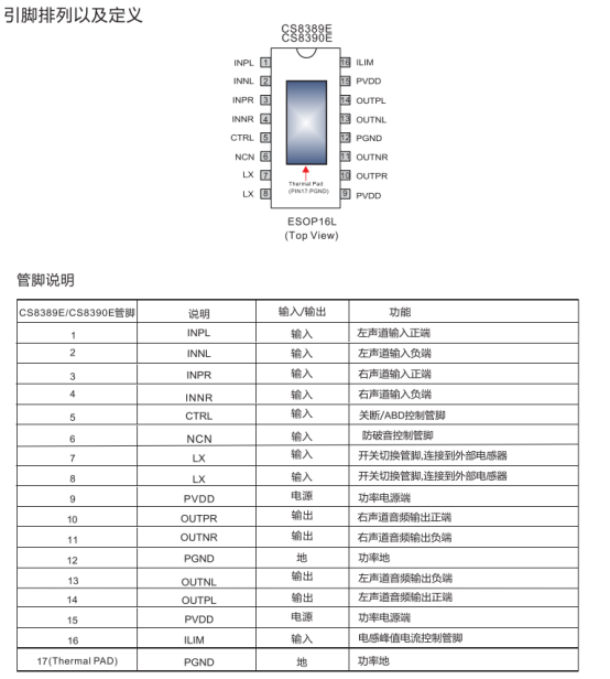 CS8389E/CS8390E是两款面向便携式蓝牙音箱的双声道音频功率放大器,采用ESOP16L封装,工作电压范围2.7~5.5V,额定工作温度-40~85℃,具备纤小尺寸与精简外围设计,适配便携音频设备需求。