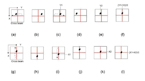 通过两条对射光路构成一个二维坐标体系XY。机器人或XYZ平台移动待校准针头在激光对针传感器的中心附近搜索,接着引导待校准物沿着Y方向从右向左移动,当待校准物第一次接触到激光束时,标记为Y1,当待校准物刚离开时的位置标记为Y2,Y方向的中心位置即为(Y1+Y2)/2的坐标,同理可找X轴的中心位置;在定位XY的中心点后,将针头移动到中心点位置,向上提起针头,当出现两个激光束同时消失,即为Z轴零点,结合以上即可确定针尖的空间零点。