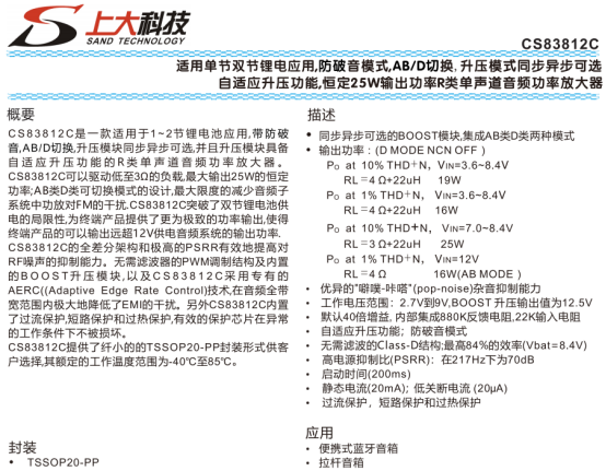 CS83812C是一款针对单/双节锂电应用的R类单声道音频功率放大器,主要适配便携式蓝牙音箱、拉杆音箱等设备,采用TSSOP20-PP封装,工作电压范围2.7~9V,额定工作温度-40~85℃,能突破锂电池供电局限,输出性能可媲美12V铅酸电池系统。