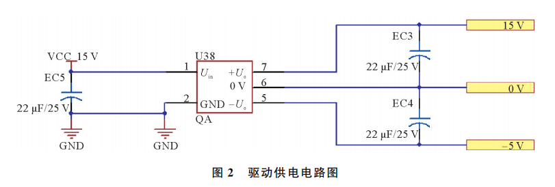 本设计供电芯片选择 B 公司的碳化硅 MOSFET 驱动器专用 DC/DC电源,该电源模块输入电压15V, 输出电压15V、-5V,驱动功率2 W,符合本设计驱 动供电需求。驱动供电电路如图2所示。