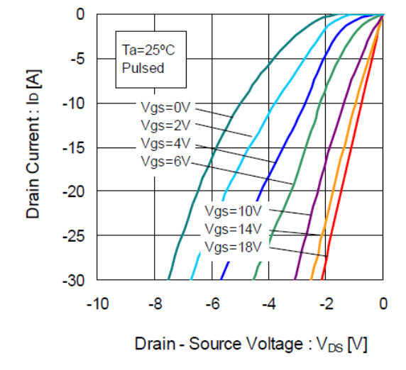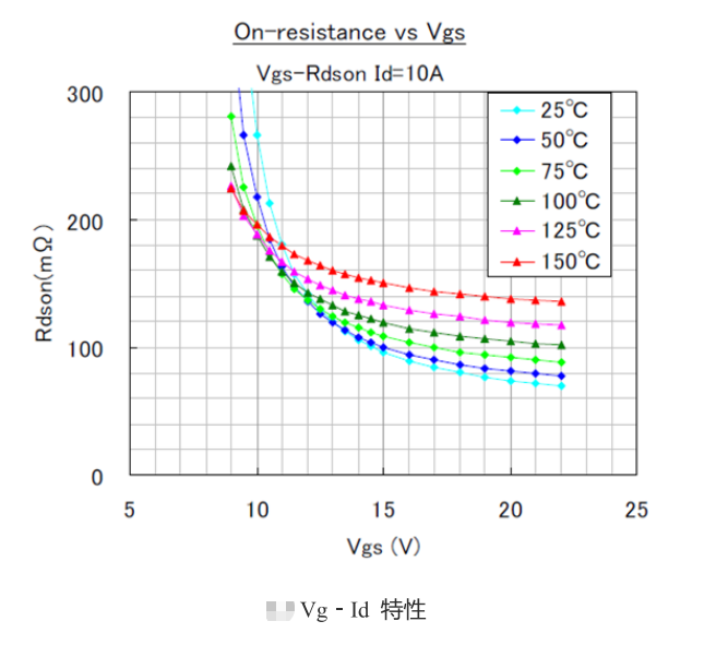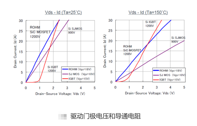 SiC‐MOSFET 的漂移层阻抗比Si‐MOSFET 低,但是另一方面,按照现在的技术水平,SiC‐MOSFET的MOS 沟道部分的迁移率比较低,所以沟道部的阻抗比Si 器件要高。因此,越高的门极电压,可以得到越低的导通电阻(Vgs=20V 以上则逐渐饱和)。如果使用一般IGBT 和Si‐MOSFET 使用的驱动电压Vgs=10~15V 的话,不能发挥出SiC 本来的低导通电阻的性能,所以为了得到充分的低导通电阻,推荐使用Vgs=18V 左右进行驱动。Vgs=13V 以下的话,有可能发生热失控,请注意不要使用。