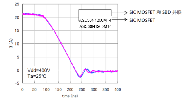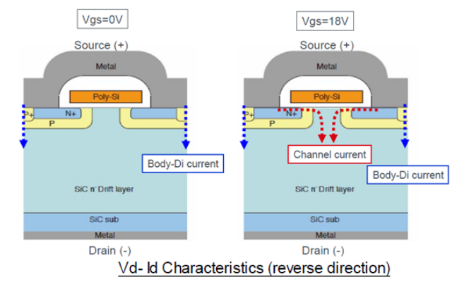 与Si‐MOSFET 一样,SiC‐MOSFET 体内也存在因PN 结而形成的体二极管(寄生二极管)。但是由于SiC 的带隙是Si 的3 倍,所以SiC‐MOSFET 的PN 二极管的开启电压大概是3V 左右,比较大,而且正向压降(Vf)也比较高。以往,当Si‐MOSFET 外置回流用的快速二极管时,由于体二极管和外置二极管的Vf 大小相等,为了防止朝向恢复慢的体二极管侧回流,必须在MOSFET 上串联低电压阻断二极管,这样的话,既增加了器件数量,也使导通损耗进一步恶化。然而,SiC‐MOSFET的体二极管的Vf 比回流用的快速二极管的Vf 还要高出很多,所以当逆向并联外置二极管时,不需要串联低压阻断二极管。