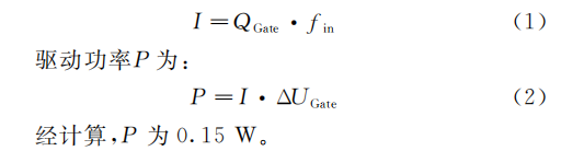 驱动功率可以从门极电荷量 QGate、开关频率fin 以及驱动器实际输出电压摆幅 ΔUGate 计算得出,本设 计的fin 为30kHz,QGate 为0.25μC,ΔUGate 为20V, 驱动器平均输出电流I 为: