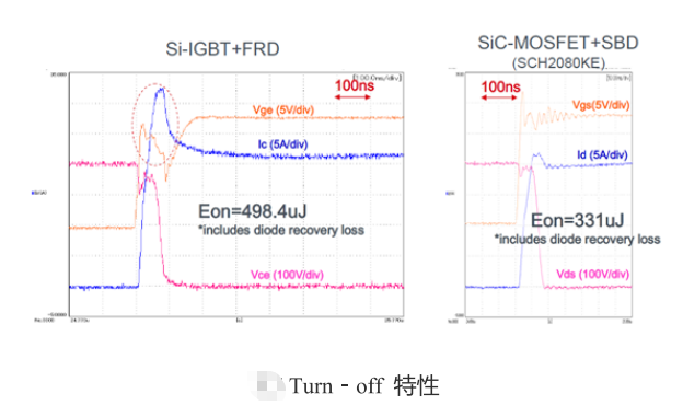 SiC‐MOSFET 的Turn‐on 速度与Si‐IGBT 和Si‐MOSFET 相当,大约几十ns。但是在感性负载开关的情况下,由通往上臂二极管的回流产生的恢复电流也流过下臂,由于各二极管性能的偏差,从而产生很大的损耗。