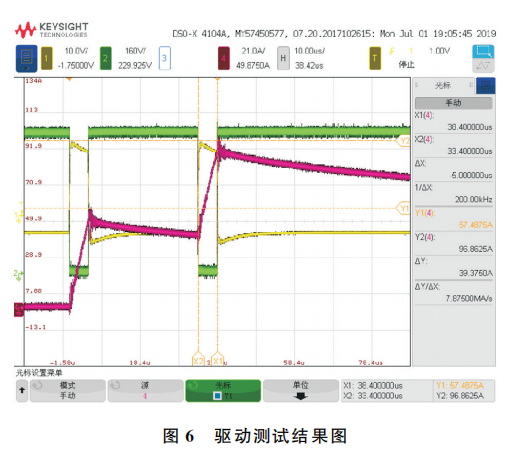 驱动测试:测试条件:母线电压610V、电感66.4nH、PWM 单脉冲宽度5μs、脉冲频率30kHz。驱动测试结果如 图6所示,黄线为碳化硅门级驱动信号,绿线为母线电 压,红线为电流。单脉冲宽度5μs,电流96A,与理论 值92A 接近。