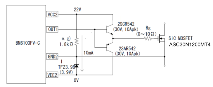 以下是采用ROHM 的驱动IC(BM6103FV‐C)并提供+18V/‐4V 电压时的电路图。当驱动大电流器件和功率模块时,推荐采用缓冲电路。