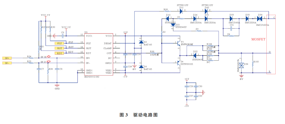 (4)为保证碳化硅 MOSFET 的可靠关断,避免噪 声干扰可能导致的误导通,应采用负压关断; (5)驱动电路带有源钳位保护、退饱和保护、故障 信号反馈等功能。