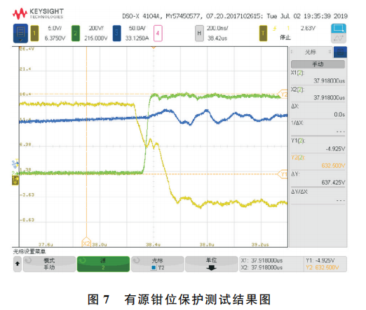 有源钳位保护测试 将有源 钳 位 电 路 中 TVS 管 改 成 SMCJ160A 型 TVS管与SMCJ400CA 型 TVS管串联,理论触发有 源钳位电压范围为625~694V。 测试条件:母线电压610V、电感 66μH、PWM 单脉冲宽度5μs。 有源钳位保护测试结果如图7所示,黄线为碳化 硅门级驱动信号,绿线为母线电压,电压尖峰630V, 门级驱动信号下降变缓,触发了有源钳位。
