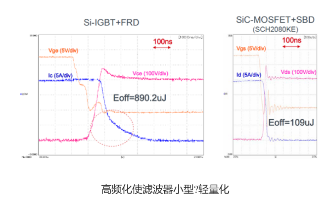 另外,由于较大的开关损耗引起的发热会致使结点温度(Tj)超过额定值,所以IGBT 通常不能在20KHz 以上的高频区域内使用,但SiC‐MOSFET 由于Eoff 很小,所以可以进行50KHz 以上的高频开关动作。通过高频化,可以使滤波器等被动器件小型化。