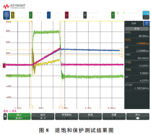 退饱和保护测试: 测试条件:将图5中上管直接用导线短路,母线电 压528V、PWM 单脉冲宽度3μs。 测试结果如图8所示,黄线为 DESAT 电压、绿线 为碳化硅门级驱动信号,红线为母线电流。短路电流 值320A,短路保护时间2.53μs,短路保护动作有效。