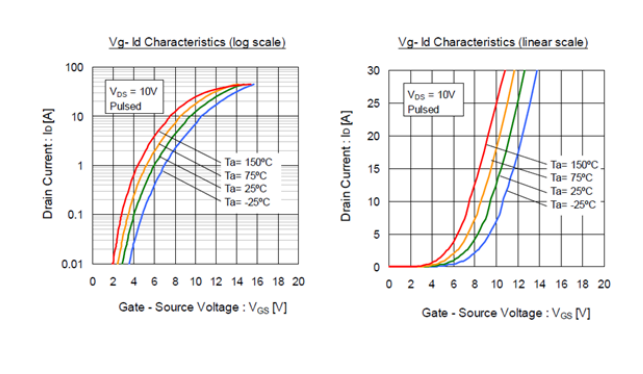 SiC‐MOSFET 的阈值电压在数mA 的情况下定义的话,与Si‐MOSFET 相当,室温下大约3V(常闭)。但是,如果流通几A 的话,需要的门极电压在室温下约为8V 以上,所以可以认为针对误触发的耐性与IGBT 相当。温度越高,阈值电压越低。