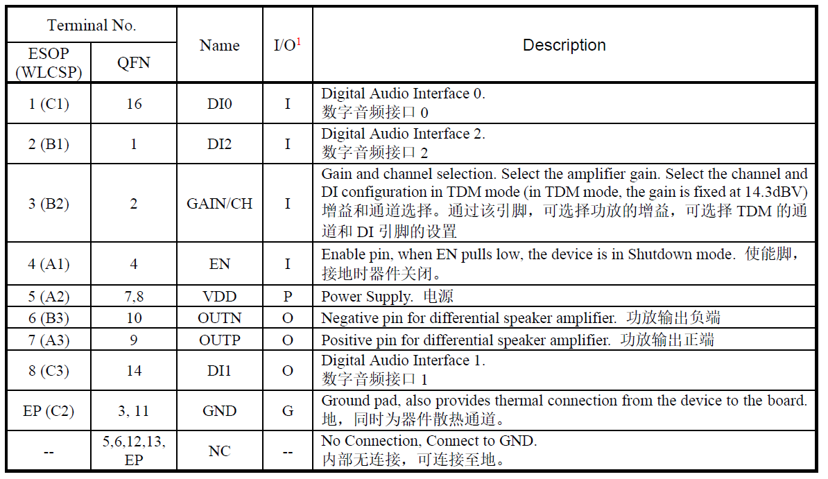 I2S (输出左、右或左/2+右/2可选择), 16bit, 24bit 或 32 bit; TDM 输入,16bit或32bit