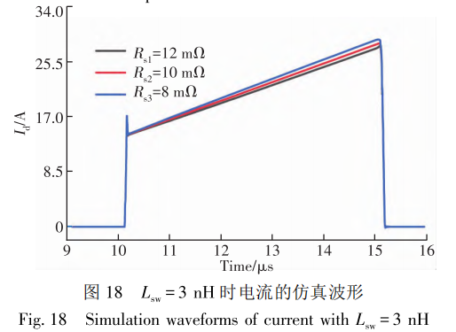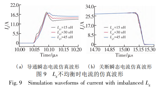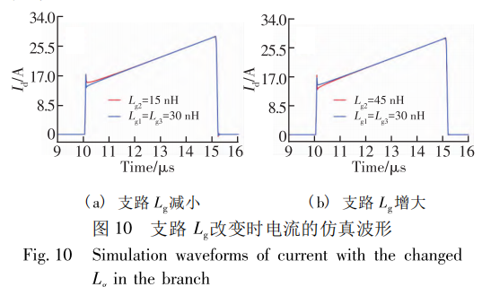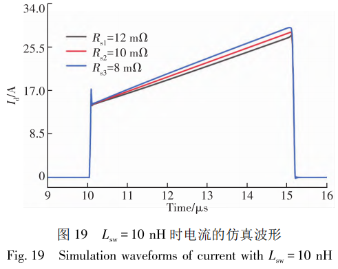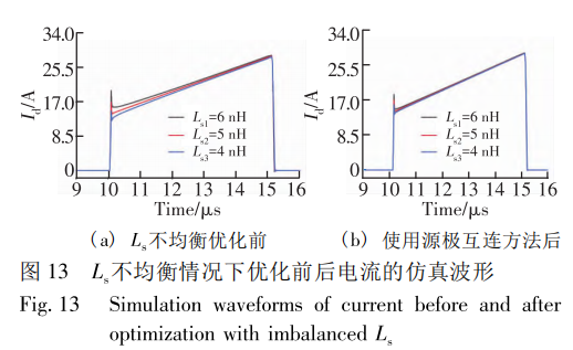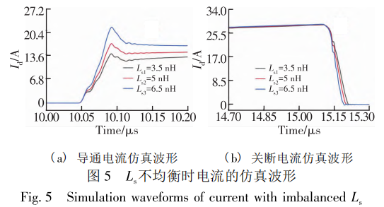 芯片源极焊盘间通常使用键合线进行连接,在仿真时可等效为键合线电阻Rsw与电感Lsw的串联,其中Ln受键合线形态影响,数值变化较大。为了研究Lsw对源极互连方法的影响,对图17所示的不均流情况,使用不同大小的L.n分别进行仿真,结果如图18和图19所示,分析可知,当Lsw 由3nH增加至10nH时,源极互连方法对不均流情况的改善能力会降低
