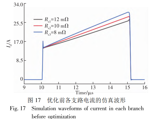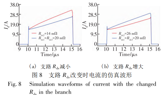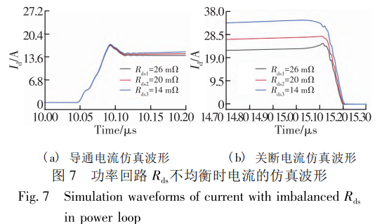 同样地,对其中一条支路上的功率回路 Rds 进行增减分析其具体影响,经双脉冲测试仿真后得到的各支路波形如图 8 所示,分析可知 : 在功率回路Rds 增大时,其对应的支路稳态电流相对减小 ; 当其减小时,则呈现相反的现象,即对应支路稳态电流增大