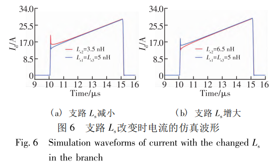 同样地 ,对其中一条支路的增减进行深入研究,经双脉冲测试仿真后得到的各支路电流波形如图所示,结合图可知,对于增大的支路,存在器件开启时间提前数纳秒的现象,同时开启时过冲电流回落幅度相对增大; 相反,在减小的支路,呈现器件开启时间滞后数纳秒,过冲电流回落幅度相对减小的现象