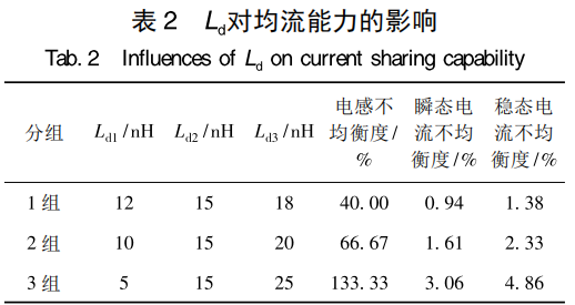 通过改变 Ld 对并联均流能力的影响进行仿真,首先改变各支路的 Ld 并计算其参数不均衡度,而后进行双脉冲测试仿真,得到第二个脉冲时各支路的电流波形如图3所示,将仿真得到的数据代入式(1)和式(2),在3组不同的Ld下得到的结果如表2所示。经分析可知: Ld的差异会导致并联时瞬态导通电流不均衡,同时也会影响稳态导通时的稳态电流不均衡