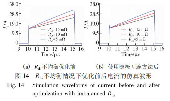 改变各支路功率回路 Rds ,对比无互连模型与源极互连模型,双脉冲测试的第二个脉冲仿真波形如图 14 所示。分析可知,该方法可以有效改善由R, 不平衡造成的电流不均衡,而无法改善由 Rd 不均衡导致的电流不均衡