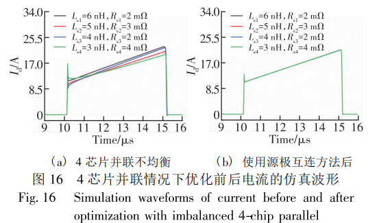 为了研究多芯片 ( >3) 并联情况下源极互连方法的适用性,建立了 4 芯片并联参数不均衡模型并进行源极互连优化,两者双脉冲测试的第二个脉冲仿真波形如图 16 所示。可见,对于 4 芯片并联时的杂散参数不均衡所导致的电流不均衡,源极互连方法也可进行良好地改善