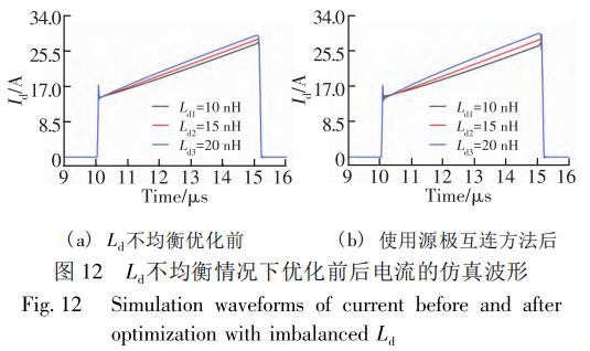 本文还提出了一种在并联芯片间进行源极互连来降低电流不均衡度的方法 由仿真结果可知,该方法对源极杂散电感及源极杂散电阻差异造成的电流不均衡有较好的优化能力,并且适用于多芯片并联的情况