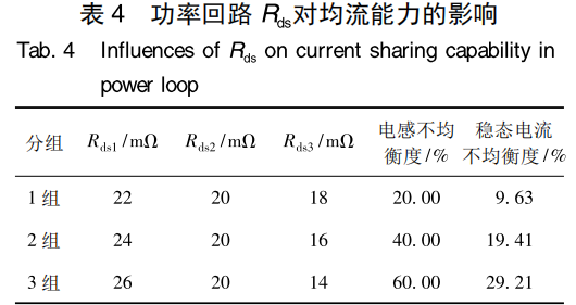 研究功率回路 Rds时,通常指的是开关换流回路中的杂散电阻,即Rds =Rd+R;。首先改变功率回路各支路的杂散电阻,并计算其不均衡度,而后进行双脉冲测试仿真,得到第二个脉冲时各支路的电流波形如图7所示,将数据代入式(1 )和式(2 )后,得到的结果如表4 所示。经分析可知: 功率回路各支路Rds的差异会导致各芯片稳态工作时通过的电流出现较严重的电流不均衡