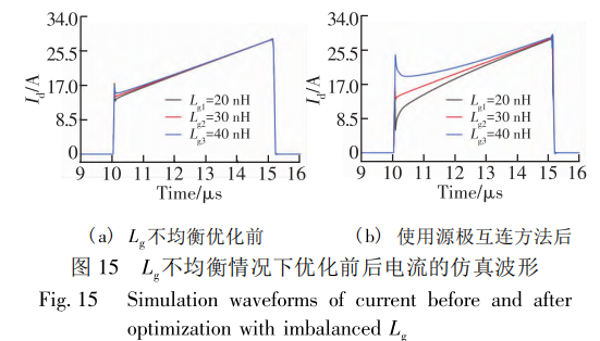 改变各支路 lg ,对比无互连模型与源极互连模型,双脉冲测试的第二个脉冲仿真波形如图 15所示。分析可知该方法无法有效改善由 lg 不均衡导致的电流不均衡
