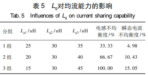 通常情况 下,功率模块中的栅极回路由于空间布局限制,电流由栅极端子到达芯片栅极焊盘的路径通常较长,所呈现的杂散电感也较大,在对多种标准型模块封装进行杂散参数提取后,发现Lg通常为20~40nH,故仿真时Lg的基准数值设定为中位值30nH。与研究功率回路的各杂散参数时相同,先改变各个支路上Lg 的大小,计算其不均衡度