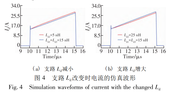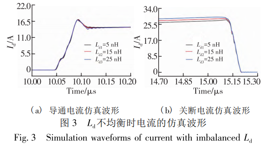 为了研究 Ld 的增减对并联均流能力的具体影响,分别对其中一条支路的 Ld 进行了增减,经双脉冲测试仿真后得到的各支路波形如图 4 所示,经分析可知 : 在某一支路的 Ld 增大时,其对应的稳态电流会相对降低,同时其关断电流的峰值则会增加,在 Ld 减小时则呈现相反的现象。