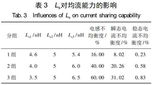 与研究 Ld 的方法相同,首先改变各支路中的L。,计算其不均衡度,而后进行双脉冲测试仿真,得到第二个脉冲时各支路的电流波形如图 5 所示,将 3 组仿真数据代入式 ( 1 ) 和式 (2) 后,得到的结果如表 3 所示,经分析可知 L:的差异会导致严重的瞬态导通电流不均衡