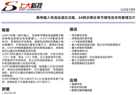 IU5918R是一款面向单节锂电池的同步降压充电管理IC,适配智能手机、移动手持设备等场景,采用SOT23-6L封装,输入电压3.5~7V,额定工作温度-40~85℃,最大充电电流2A且可通过外部电阻调节,集成功率MOS与同步开关架构,外围器件少,方案紧凑、BOM成本低。