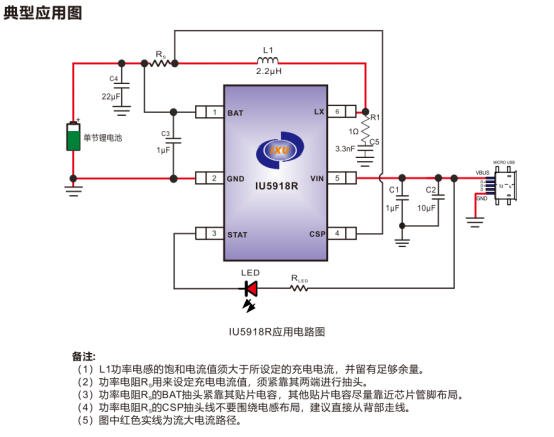 状态指示与应用配置:STAT管脚外接LED,充电时常亮、充满熄灭,异常(过压、短路、过温、超时)时2Hz闪烁;恒流充电电流通过检测电阻Rs设定,2A电流对应25mΩ电阻,需匹配电阻功率;电感选用2.2uH、饱和电流>2.6A、DCR<50mΩ的型号。