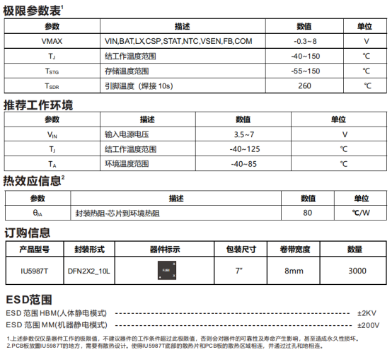 IU5987T是支持太阳能充电的单节锂电池同步降压充电管理IC,适配磷酸铁锂电池包及多规格单节锂电包,采用DFN2X2_10L封装,输入电压3.5~7V,额定工作温度-40~85℃,集成功率MOS,外围少、方案紧凑。