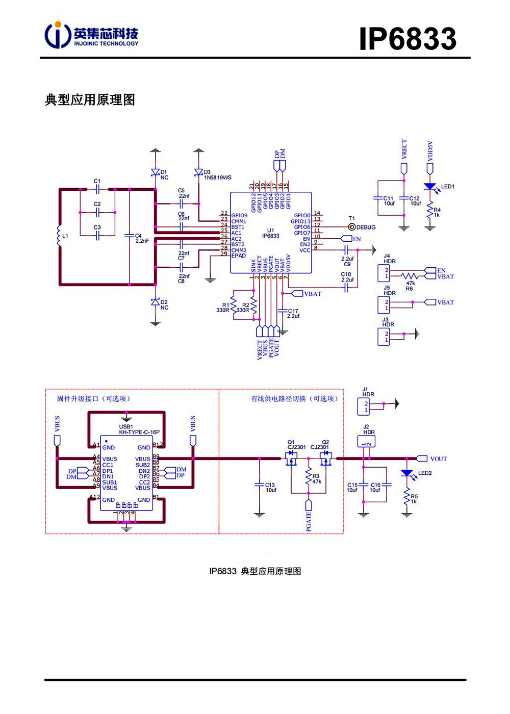 此外,IP6833内置温度传感器,能够实时监测芯片温度,在高温情况下可自动调整充电功率或暂停充电,有助于防止电流倒灌,保护电池和芯片安全。这些设计使IP6833在多种应用环境中能够保持稳定运行。