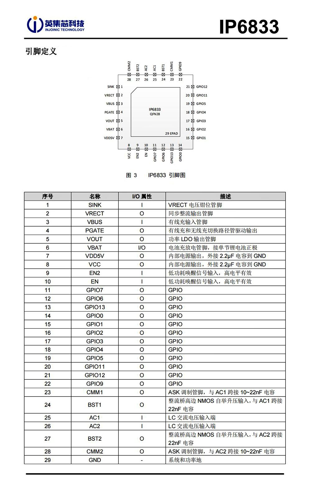 此外,IP6833采用QFN28(4mm×4mm)的小型封装,便于集成至智能手表、智能手环等空间有限的产品中,为产品的小型化设计提供了支持。