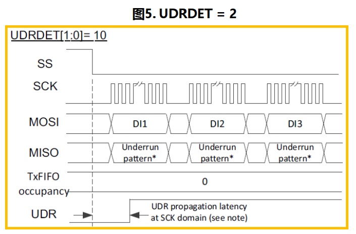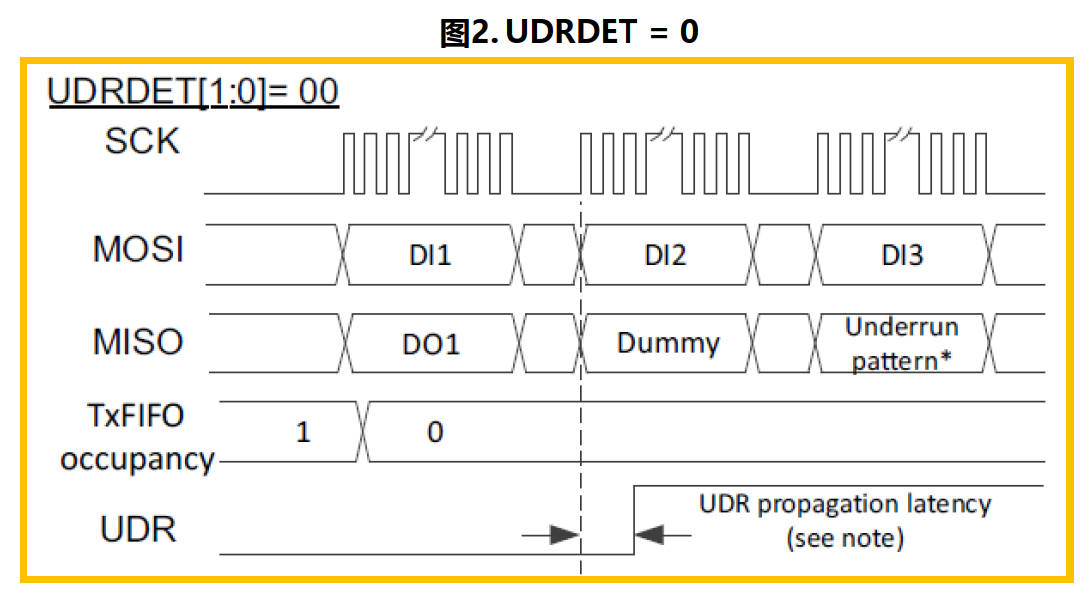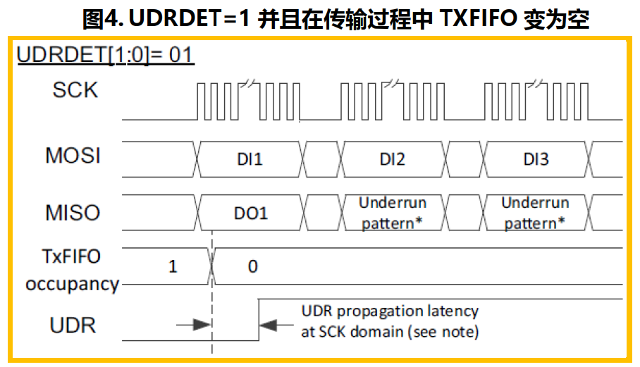 UDRCFG字段配置(如全 0、全 1、交替码等),用于主机识别下溢异常。 - 硬件延迟注意:下溢事件发生后,需经过几个 SPI 时钟周期才能检测到(或触发中断),软件处理需预留缓冲时间。