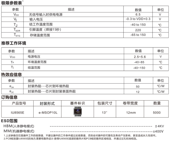 IU8565E是一款双通道D类音频功率放大器,支持桥式扬声器放大与单端立体声耳机模式,适配LCD-TV、笔记本电脑、USB接口扬声器等场景,采用e-MSOP10L封装,工作电压2.5~5.6V,额定工作温度-40~85℃,外围器件少,音频输出质量高。