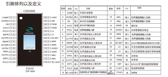 CS8396E是一款适配1~3节锂电应用的R类音频功率放大器,支持立体声与单声道切换,主打便携式音箱场景,采用EQA28封装,工作电压3.0~13V,额定工作温度-40~85℃,内置BOOST升压模块与扩频模块,兼具大功率输出与低干扰特性。