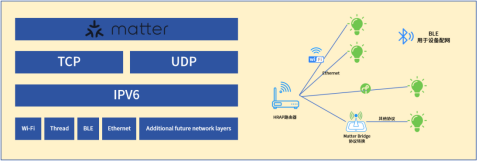 如下图所示,Matter并不是一个全新的协议,它复用了成熟的TCP/IP协议族(TCP/UDP为传输层协议,IPv6为网络层基础),是应用层上的统一标准,可兼容Wi-Fi、Thread、BLE与以太网等基于IP技术的底层通信协议,亦可通过网桥接入Zigbee、Z-Wave等其他协议;