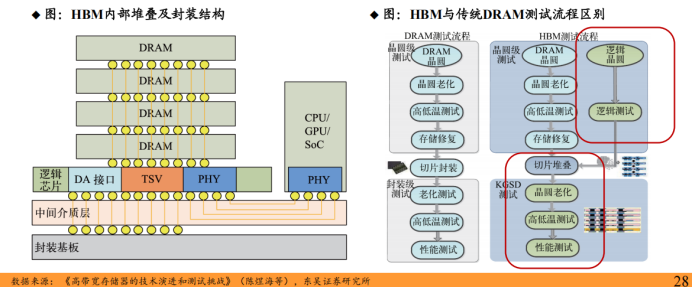 HBM测试复杂度倍增:HBM采用多层DRAM堆叠结构及2.5D封装技术,测试包括晶圆级测试和KGSD测试。其高集成度、内嵌式I/O及裸片堆叠封装的技术特征,大幅提升了存储测试工艺的复杂度和难度。