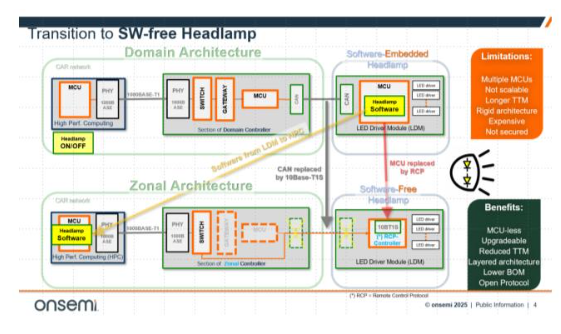 安森美的创新主要聚焦两大方向。其一,对车灯所属的低速网络进行升级,采用十兆以太网替代传统CAN总线,并取消中间网关,简化通信链路,提升数据传输效率与架构扩展性。其二,采用 RCP芯片,直接替代传统车灯模块中的 MCU。