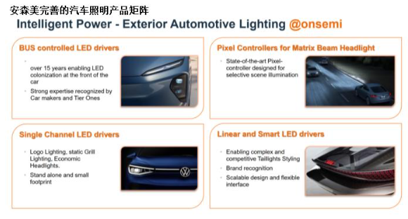 在汽车照明领域,安森美提供覆盖四大类别的完整解决方案,总线控制 LED 驱动器、矩阵光束大灯像素控制器、单通道 LED 驱动器、线性和智能 LED 驱动器。其中在总线控制 LED 驱动器领域,安森美凭借超 15 年经验获车企与一级供应商认可;矩阵光束大灯像素控制器实现先进的选择性场景照明;单通道 LED 驱动器适用于车标灯、静态格栅灯等小体积场景;线性和智能 LED 驱动器赋能复杂尾灯造型,兼具品牌辨识度与可扩展设计。这些方案全方位满足汽车外部照明的多元需求,推动车灯系统智能化升级。