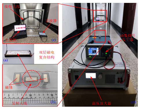 实验过程:发射天线由双层复合磁电材料和磁体组成,将磁体置于天线磁化方向上提供偏置磁场,调节磁体间距产生发射天线所需的最佳偏置磁场;激励电信号通过信号发生器送入高压放大器,由高压放大器激励磁电复合结构产生甚低频电磁波,实现甚低频电磁波的发射和信息的加载。由磁环接收线圈接收甚低频信号,信号经示波器传输处理到上位机完成通信。