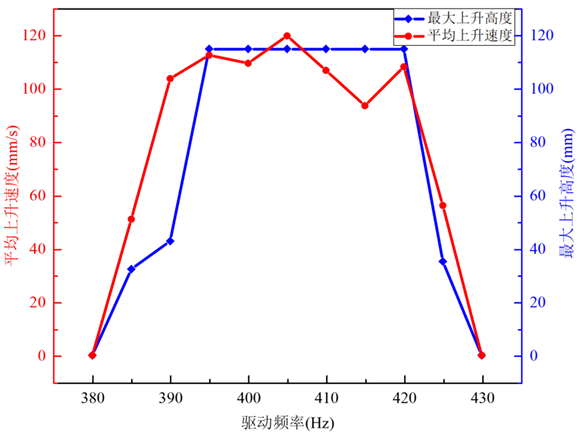 2、速度与高度:405Hz时无负载爬升速度最快,达120mm/s;395-420Hz时最大爬升高度11.5cm(受限于测试杆长度),换用20cm杆可爬至顶部并跃出,速度与频率关系图见图4。